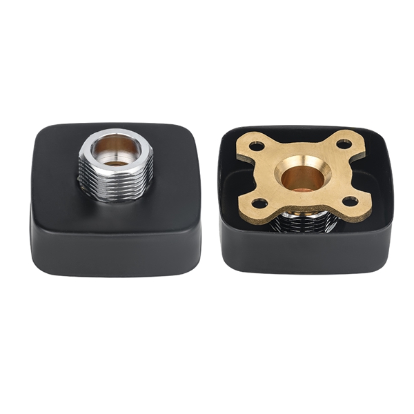 แผ่นก๊อกน้ำฝักบัวทรงสี่เหลี่ยมสีดำ จุดประสงค์หลักคือเพื่อให้มีฐานที่แข็งแรง แบน และติดตั้งง่ายสำหรับก๊อกน้ำติดผนัง ผลิตภัณฑ์ใช้โครงสร้างคอมโพสิตของทองเหลืองและเหล็กกล้าคาร์บอน: แรงหลักและชิ้นส่วนเชื่อมต่อที่สัมผัสโดยตรงกับผนังและส่วนต่อประสาน faucets ใช้ทองเหลืองเพื่อให้มั่นใจถึงความต้านทานการกัดกร่อนและความแน่นของการเชื่อมต่อในระยะยาว เนื่องจากเป็นโครงสร้างรองรับหลัก ตัวแผ่นจึงทำจากเหล็กกล้าคาร์บอนที่มีความแข็งแรงสูง ซึ่งให้ความแข็งแกร่งในการรองรับที่จำเป็นทั้งหมด และป้องกันการเสียรูปเนื่องจากความเครียดในระยะยาว พื้นผิวของตัวแผ่นผ่านการชุบด้วยไฟฟ้าและกระบวนการอื่นๆ ทำให้มีลักษณะเป็นสีทองและทำความสะอาดง่าย ได้รับการออกแบบให้เป็นทรงสี่เหลี่ยมมาตรฐานพร้อมรูติดตั้งที่กำหนดไว้ล่วงหน้าเพื่อให้เข้ากับอุปกรณ์เสริม faucet ทั่วไป และทำให้กระบวนการติดตั้งง่ายขึ้น
